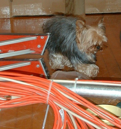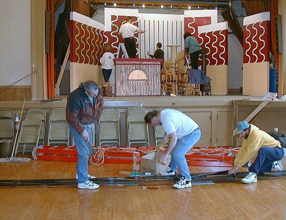 Neil Davies and Greg Davis (both technical crew) work with Cliff to erect